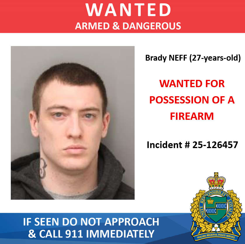 Police say 27-year-old Brady Neff is wanted for possession of a firearm, after police surrounded a home in Port Colborne this morning. If seen, police say DO NOT approach him, and instead contact police immediately. Neff is considered armed and dangerous.